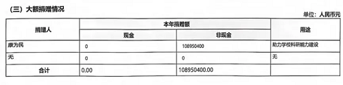 哈爾濱工業(yè)大學(xué)教育發(fā)展基金會2024年度工作報告截圖記者查詢哈爾濱工業(yè)大學(xué)教育發(fā)展基金會2024年度工作報告發(fā)現(xiàn),2024年度基金會收到捐贈人康為民的非現(xiàn)金捐贈,合計(jì)金額為108950400元,捐贈用途為“助力學(xué)??蒲心芰ㄔO(shè)”。