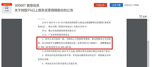 2020年6月21日,廣州賽意信息科技股份有限公司發(fā)布公告稱,廣州賽意信息科技股份有限公司持股5%以上股東——佛山市美的投資管理有限公司與廣東省和的慈善基金會簽署《捐贈協(xié)議》,為推動公益慈善發(fā)展,美的投資擬向基金會無償捐贈公司股票41990400股,占公司總股本的10.54%。按照當(dāng)時的市值計(jì)算,這部分股權(quán)市值約為9.95億元。