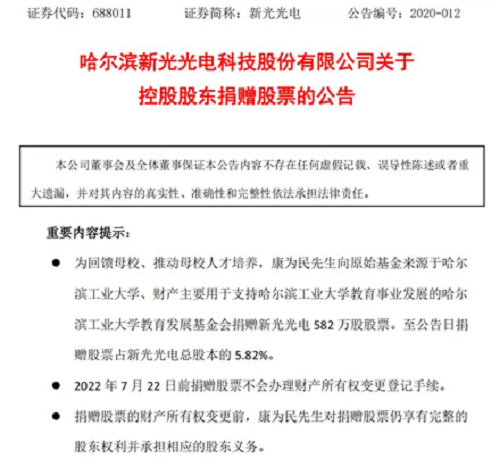 新光光電公告2020年6月2日,新光光電發(fā)布關(guān)于控股股東捐贈股票的公告。公告稱,公司于2020年6月1日接到控股股東康為民通知,其與哈爾濱工業(yè)大學(xué)教育發(fā)展基金會簽署了《捐贈協(xié)議書》。根據(jù)公告,為回饋母校、推動母校人才培養(yǎng),康為民向哈爾濱工業(yè)大學(xué)教育發(fā)展基金會捐贈新光光電582萬股股票。至公告日,捐贈股票占新光光電總股本的5.82%。按照當(dāng)時股價計(jì)算,這批股票價值高達(dá)2.4億元。