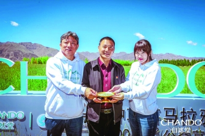 張波副縣長(中)為自然堂公益一行贈送草籽2019年7月,伽藍(lán)集團公關(guān)傳播總經(jīng)理陳涓玲再次踏足西藏這片神圣的土地。