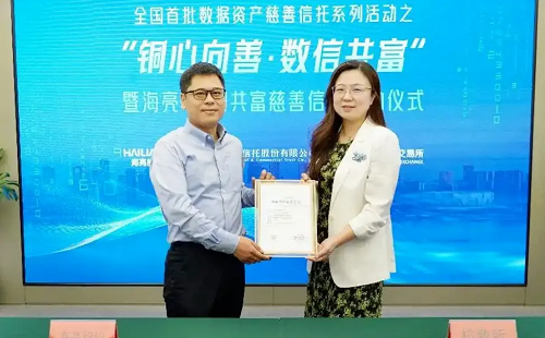 “杭工信•海亮數(shù)智共富慈善信托”在杭州簽約。圖片來源:數(shù)智未來研究院例如,由杭州工商信托股份有限公司、杭州數(shù)據(jù)交易所與浙江海亮股份有限公司共同發(fā)起的“杭工信•海亮數(shù)智共富慈善信托”于9月5日正式簽約,標(biāo)志著全國首單以數(shù)據(jù)收益權(quán)作為信托財(cái)產(chǎn)的慈善信托項(xiàng)目正式落地。