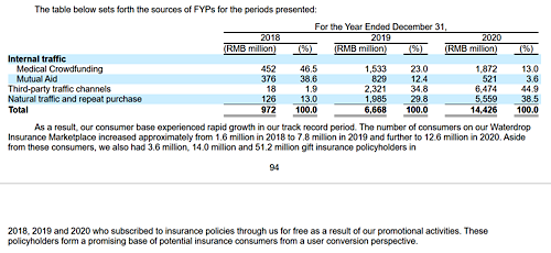 “通過醫(yī)療眾籌、互助平臺和保險市場,我們構建了一個龐大的社會保障和支持網(wǎng)絡,提高了人們的保險意識。”水滴公司在招股書中介紹,“我們的醫(yī)療眾籌業(yè)務將大量流量引向我們的保險市場。2018年、2019年和2020年實現(xiàn)的FYP(first year premium,首年保費)約46.5%、23.0%和13.0%來自水滴的醫(yī)療眾籌平臺。”