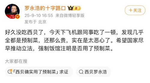 9月10日,羅永浩在微博公開吐槽連鎖餐飲品牌西貝:“幾乎全是預(yù)制菜,還那么貴”。次日,西貝創(chuàng)始人賈國龍用三個(gè)“一定”回應(yīng):“我們一定會(huì)起訴他,一定一定會(huì)起訴他!”相關(guān)話題隨即沖上熱搜。