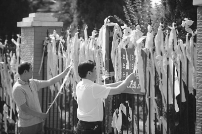 6月6日,監(jiān)利縣玉沙小學(xué),大門兩側(cè)長長的欄桿上掛滿了黃絲帶,上面寫滿了孩子們的祈愿?!皷|方之星”客輪翻沉事件發(fā)生后,監(jiān)利這個港口小城民間蘊(yùn)藏的力量瞬時爆發(fā)。來自社會各界的志愿者給參加救援的官兵們送飯,為遇難者家屬提供免費(fèi)住宿餐飲,調(diào)度礦泉水、雨傘等物資,綁上黃絲帶提供免費(fèi)車輛服務(wù)。