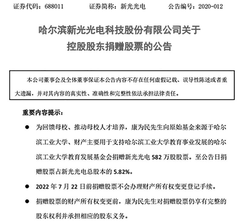 近年來(lái)股權(quán)捐贈(zèng)已成為企業(yè)家/企業(yè)支持慈善事業(yè)的共同選擇和未來(lái)趨勢(shì)。而由于經(jīng)濟(jì)波動(dòng)等不確定性影響因素增多,有關(guān)捐贈(zèng)承諾兌現(xiàn)和落地執(zhí)行情況也備受社會(huì)關(guān)注,由此引發(fā)的爭(zhēng)議一直未斷。 ■ 本報(bào)記者 皮磊 據(jù)多家媒體報(bào)道,哈爾濱新光光電科技股份有限公司(簡(jiǎn)稱“新光光電”)日前發(fā)布公告稱,公司近日收到嵩縣監(jiān)察委員會(huì)簽發(fā)的關(guān)于對(duì)公司控股股東、實(shí)際控制人、董事長(zhǎng)、總經(jīng)理康為民的《立案通知書(shū)》和《留置通知書(shū)》,康為民被實(shí)施留置措施。 針對(duì)上述情況,有媒體致電新光光電證券部嘗試了解更多細(xì)節(jié)。該公司工作人員回應(yīng)稱,“目前尚未獲得更多確切消息。”工作人員表示,公司內(nèi)控完善,已召開(kāi)臨時(shí)董事會(huì)落實(shí)工作安排,主營(yíng)業(yè)務(wù)與產(chǎn)品方向未變。 作為一家軍工電子信息企業(yè),該消息一經(jīng)發(fā)布即引發(fā)外界猜測(cè)。不過(guò),在關(guān)注事件進(jìn)展的同時(shí),有關(guān)康為民曾向其母校哈爾濱工業(yè)大學(xué)捐贈(zèng)582萬(wàn)股股票一事被翻出,甚至對(duì)該筆捐贈(zèng)的程序和動(dòng)機(jī)提出質(zhì)疑。事實(shí)上,近年來(lái)股權(quán)捐贈(zèng)已成為企業(yè)家/企業(yè)支持慈善事業(yè)的共同選擇和未來(lái)趨勢(shì)。而由于經(jīng)濟(jì)波動(dòng)等不確定性影響因素增多,有關(guān)捐贈(zèng)承諾兌現(xiàn)和落地執(zhí)行情況也備受社會(huì)關(guān)注,由此引發(fā)的爭(zhēng)議一直未斷。 582萬(wàn)股股權(quán)捐贈(zèng)始末 據(jù)新光光電官網(wǎng)介紹,新光光電成立于2007年11月,注冊(cè)資本1億元,是東北地區(qū)科創(chuàng)板上市公司。該公司是一家將像方掃描成像制導(dǎo)技術(shù)、多光學(xué)波段合成技術(shù)等先進(jìn)光電技術(shù)應(yīng)用于光學(xué)制導(dǎo)類武器研制的企業(yè),致力于服務(wù)國(guó)防科技工業(yè)先進(jìn)武器系統(tǒng)研制等領(lǐng)域。公開(kāi)資料顯示,康為民父子都是哈工大人,康為民本科和碩士都在哈工大就讀,隨后又在哈工大工作20多年,直到創(chuàng)辦上市公司。 2020年6月2日,新光光電發(fā)布關(guān)于控股股東捐贈(zèng)股票的公告。公告稱,公司于2020年6月1日接到控股股東康為民通知,其與哈爾濱工業(yè)大學(xué)教育發(fā)展基金會(huì)簽署了《捐贈(zèng)協(xié)議書(shū)》。根據(jù)公告,為回饋母校、推動(dòng)母校人才培養(yǎng),康為民向哈爾濱工業(yè)大學(xué)教育發(fā)展基金會(huì)捐贈(zèng)新光光電582萬(wàn)股股票。至公告日,捐贈(zèng)股票占新光光電總股本的5.82%。按照當(dāng)時(shí)股價(jià)計(jì)算,這批股票價(jià)值高達(dá)2.4億元。 按照捐贈(zèng)協(xié)議,該筆捐贈(zèng)用于設(shè)立“松高·卓越工程師獎(jiǎng)助學(xué)金”、設(shè)立“松高·優(yōu)秀中青年教師貢獻(xiàn)獎(jiǎng)”、設(shè)立“松高·優(yōu)秀科技成果獎(jiǎng)”、設(shè)立“新興產(chǎn)業(yè)與技術(shù)發(fā)展創(chuàng)新基金”等。 2024年11月4日,新光光電發(fā)布關(guān)于控股股東捐贈(zèng)股份完成過(guò)戶暨股東權(quán)益變動(dòng)的提示性公告。公告稱,公司于2024年11月4日收到康為民通知,康為民與基金會(huì)的非交易過(guò)戶已經(jīng)在中國(guó)證券登記結(jié)算有限公司上海分公司完成過(guò)戶登記手續(xù),并出具了《證券過(guò)戶登記確認(rèn)書(shū)》。 公告顯示,本次股份捐贈(zèng)過(guò)戶登記完成后,康為民及其一致行動(dòng)人持有公司股份52348457股,占公司總股本的52.35%,仍為公司控股股東。本次股份捐贈(zèng)過(guò)戶登記完成后,哈爾濱工業(yè)大學(xué)教育發(fā)展基金會(huì)持有公司無(wú)限售流通股582萬(wàn)股,占當(dāng)時(shí)公司總股本的5.82%。 該公告還特別指出,本次股份捐贈(zèng)未違反《上市公司收購(gòu)管理辦法》《上市公司股東、董監(jiān)高減持股份的若干規(guī)定》《上海證券交易所上市公司股東及董事、監(jiān)事、高級(jí)管理人員減持股份實(shí)施細(xì)則》《上海證券交易所科創(chuàng)板上市公司自律監(jiān)管指南》等有關(guān)法律、法規(guī)、部門(mén)規(guī)章及規(guī)范性文件和《公司章程》的規(guī)定,也不存在相關(guān)股東因本次股份轉(zhuǎn)讓而違反尚在履行的承諾的情形。 記者查詢哈爾濱工業(yè)大學(xué)教育發(fā)展基金會(huì)2024年度工作報(bào)告發(fā)現(xiàn),2024年度基金會(huì)收到捐贈(zèng)人康為民的非現(xiàn)金捐贈(zèng),合計(jì)金額為108950400元,捐贈(zèng)用途為“助力學(xué)??蒲心芰ㄔO(shè)”。 股權(quán)捐贈(zèng)已成趨勢(shì) 梳理近年來(lái)的大額捐贈(zèng)案例發(fā)現(xiàn),股權(quán)捐贈(zèng)已成為部分企業(yè)家/企業(yè)支持慈善事業(yè)的首要選項(xiàng): 2025年 7月 10日晚,寧德時(shí)代發(fā)布關(guān)于股東無(wú)償捐贈(zèng)部分公司股份的進(jìn)展公告。公告稱,公司股東及副董事長(zhǎng)李平及其配偶擬向上海復(fù)旦大學(xué)教育發(fā)展基金會(huì)捐贈(zèng)其持有的公司405萬(wàn)股股票,上述股票均為